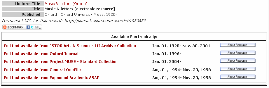 If you need to find a specific journal and are not sure if the Library has it available in print or electronically, search by journal title and limit to periodicals. For example, here is the result of a search on Music and Letters: