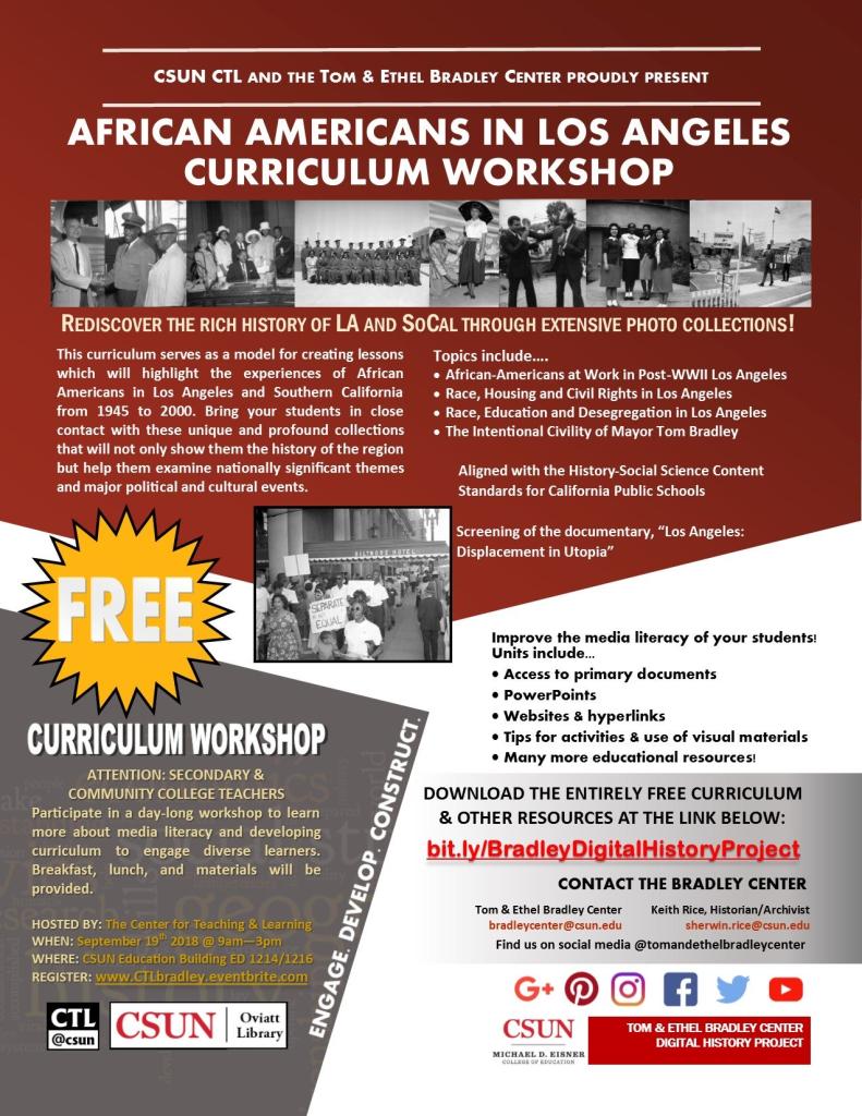 Four sets of lessons ask challenging questions, and provide teachers and their students access to the photographs which have been digitized with the assistance of a federal grant from the National Endowment for the Humanities, video and audio oral interviews, maps and interesting ideas for classroom activities. Topics include African Americans at Work in Post-WWII Los Angeles, Race, Housing and the fight for Civil Rights in Los Angeles, the Struggle to Desegregate Los Angeles Schools, and the Intentional Civility of Mayor Tom Bradley. Click here to reserve a seat in our workshop.