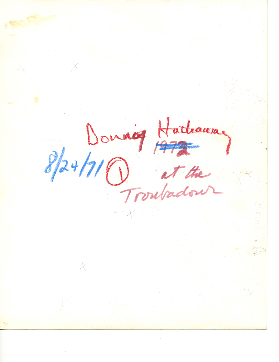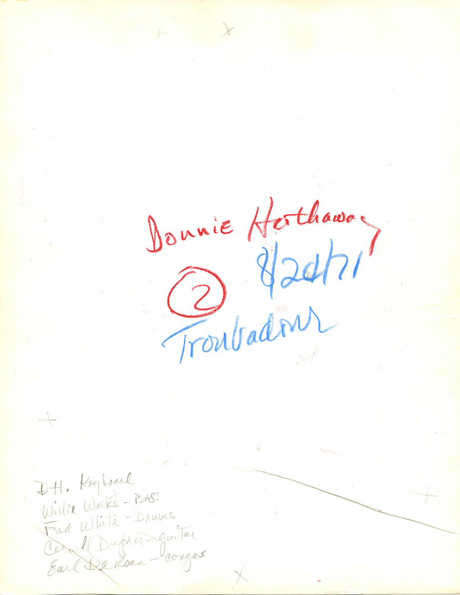 Live was recorded during several performances in late summer and early fall of 1971 at two locations: Doug’s Troubadour in Los Angeles and the Bitter End in New York. Charles’s photographs are dated August 24, 1971, and the location is the Troubadour. The Troubadour is not a fancy high-tech venue. It is a very small intimate space that introduced up and coming singer songwriters to the world during the 1960s and 1970s. It is a live music performance venue. So, Hathaway and his band of phenomenal musicians performed without flashy light shows, pyro techniques, or synchronized choreography. The performance is in the musicians and the music. Roland Charles images visually document what is heard on the Live album’s Troubadour dates, Donny Hathaway-vocals and keyboards; Mike Howard-guitar, Phil Upchurch-guitar; Willie Weeks-bass guitar; Earl De Rouen-congas; and Fred White-drums at their best on every note played and every word sung. What makes this small collection of images so important is that they are the only images to my knowledge that exist of this extraordinary performance in a public institution. Unfortunately, on January 19, 1979, Donny Hathaway fell fifteen stories from a window in his room at the Essex Hotel in New York City in an alleged suicide. He was 33 years old. His daughter Lalah Hathaway continues his legacy. She has a beautiful voice like her father and is a very successful solo artist in her own right.