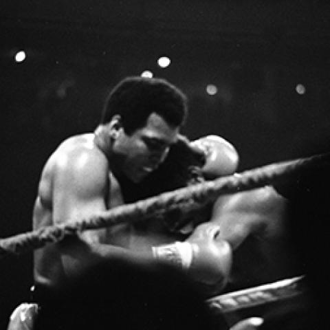 The Tom & Ethel Bradley Center contains over 100 images of the greatest heavyweight boxer of all time, Muhammad Ali.The images featured here were taken by photographers Harry Adams and Guy Crowder, both of whom documented the African American community in Los Angeles during the second half of the twentieth-century. Muhammad Ali was born Cassius Marcellus Clay Jr. in Louisville, Kentucky on January 17, 1942. His life changed forever when he told Louisville police officer and boxing coach Joe Martin that he was going to “whup” whoever stole his bicycle. Ten years after his bike was stolen on February 25, 1964, Clay would become the youngest boxer at age 22, to take a title from a reigning heavyweight champion when he scored a TKO (Technical Knockout) against the intimidating Sonny Liston.