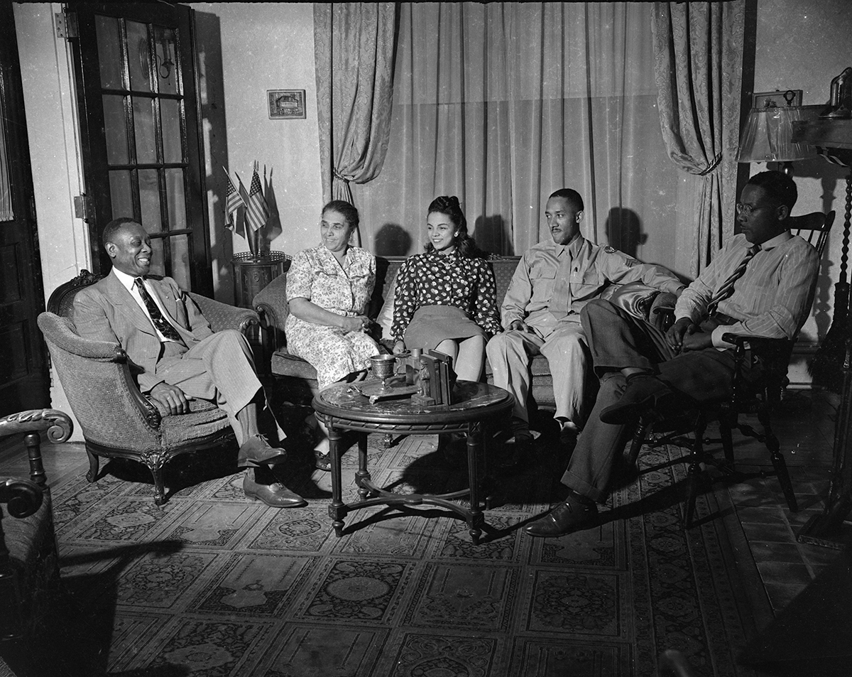 Cecil Poole received a JD from Harvard Law School in 1939. Admitted to the Pennsylvania State Bar, he pursued private practice in Pittsburgh. He was briefly a member of the National Labor Relations Board in Washignton D.C., but ultimately served in the US army until 1945. After the war, he picked up his law career in Northern California, where he climbed up the ranks with appointments in 1961 as U.S. Attorney for the Northern District of California (the first Black U.S. Attorney in the continental U.S.), in 1976 as the first Black Federal Judge in Northern California, and in 1979 as the Judge to the U.S. Court of Appeals for the Ninth Circuit (later becoming Senior Judge). As U.S. Attorney, his time coincided with the high-profile protests against the Vietnam War in the Bay Area. Olmstead photographed Poole in a military uniform sitting with his siblings and parents.