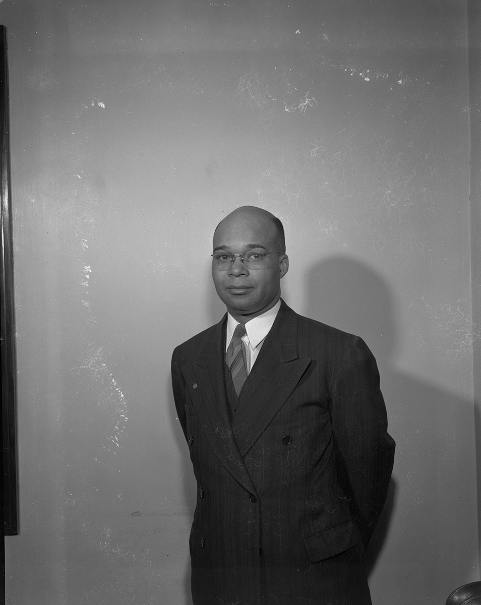 Olmstead included for the negative’s description, “1st Black White House Correspondent,” possibly referring to his committee-appointed membership in 1947 to the Senate and House press galleries as the first African American journalist to receive that permission. Olmstead photographed Prattis in suit and tie, possibly at the Pittsburgh Courier where they both worked.