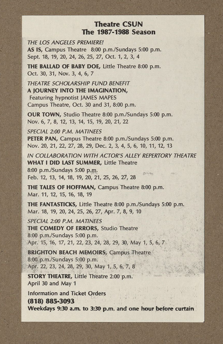 The University Archives and University Archives Photograph Collection contain photos and programs from the CSUN Theatre Department and its Teenage Drama Workshop (TADW) d