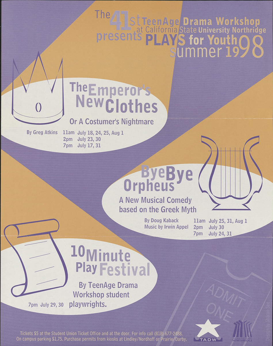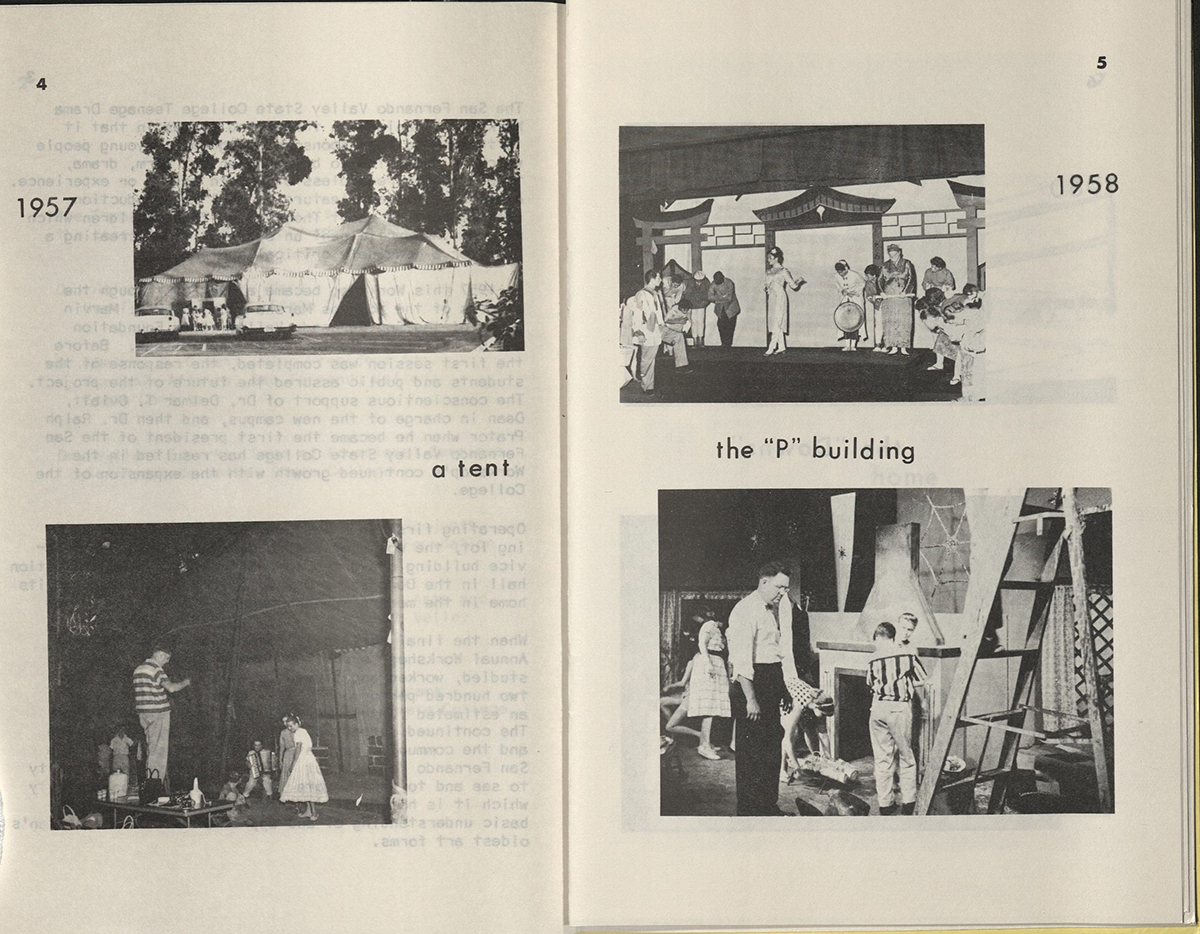 ating as far back as 1958 when the Teenage Drama Workshop was established (even predating the Theatre Department!). Then, CSUN was still known as San Fernando Valley State College. Enrolled teens spend the summer season participating in a range of classes including acting, improvisation, and movement, which culminate in multiple stage productions. Both then and now, the Teenage Drama Workshop and the Theatre Department work together to onboard Theatre majors and alumni to run the shows through assistant direction, stage management, choreography, and more, making it a tight-knit, multi-generational theatre community.