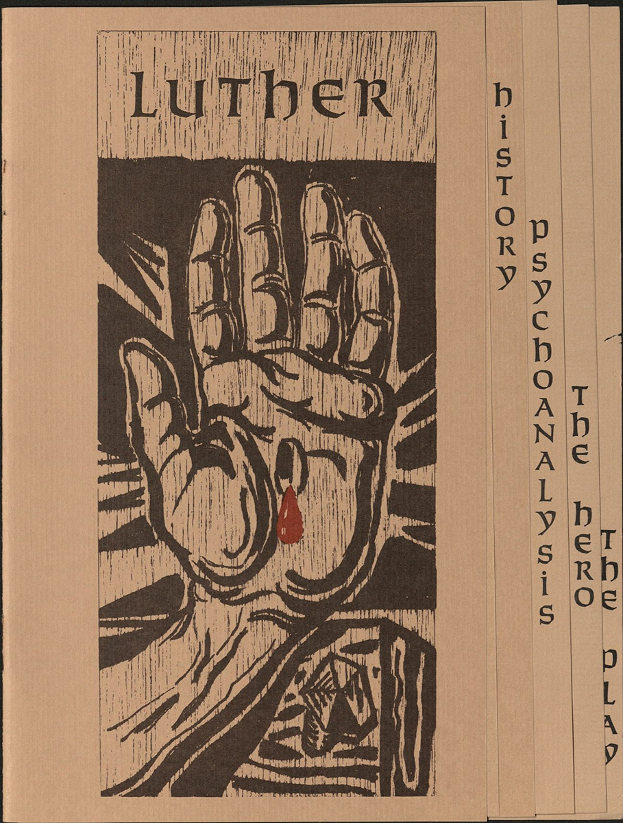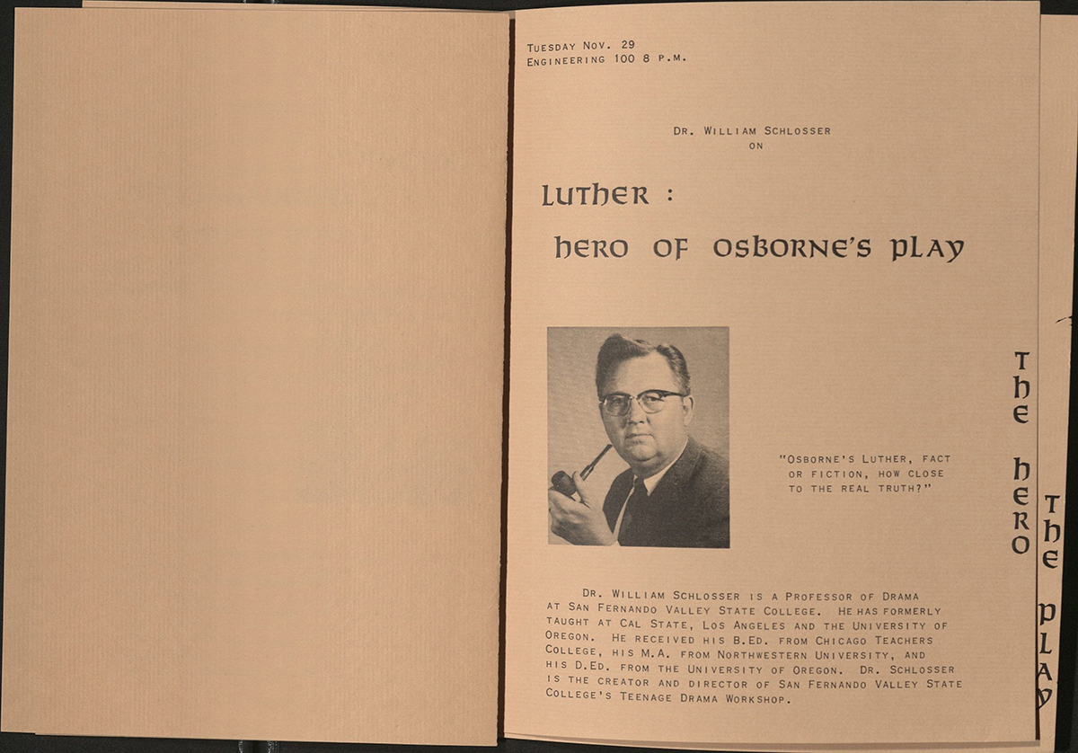 As for the Theatre Department, the archives hold programs, printed images, and 35mm color film photos of productions. For the 1966 production of Luther, the department hosted a lecture series diving into all aspects of the play. Lecture spotlights include Drama professor and TADW founder Dr. William Schlosser analyzing the play’s hero, and a psychoanalysis of the character by Methodist minister and professor of Christian education Dr. Allen Moore. The Department promoted the show to the local Lutheran community. In a letter to the Lutheran Women’s Campus Association they promoted a collaboration with the Lutheran Campus Ministry, increasing the ticket price of $1.50 to $2.50 to benefit the Ministry. Although it sounds dirt cheap, comparatively tickets have pretty much stayed the same price with inflation, with $2.50 coming out to about $23 in today’s money.