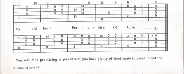A final example, this time from music for “Paradise of Love,” discloses that “You will find practicing a pleasure if you have plenty of sheet music to avoid monotony.” Piecing these three examples together, the messaging becomes coherent and clear: purchasing Oahu Music Company sheet music will help you practice more, which will elevate your social status.
