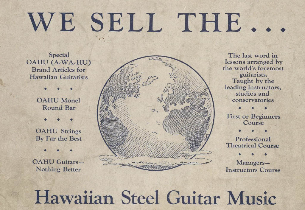 Guitar cases, steel bars for left hand playing, strings, and more sheet music all appear in the advertisements, usually alone on the back cover or below the title information on the front cover. These ads for material goods obfuscate the advertisements for instructor and management training with the Oahu Music Company. For example, included in the sheet music of “Orientale,” where one would normally find a pithy, inspirational statement about the value of hard work and music learning, the editor instead chose to insert an ominous warning– “If you value your future, inquire into the possibilities of the Managers Instructors Course.”